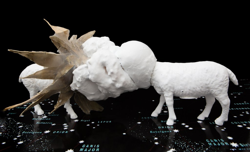 Installation on sky map, plastic found materials, PU foam, silicone, spray paint, silicone paint, eggs, plants.
