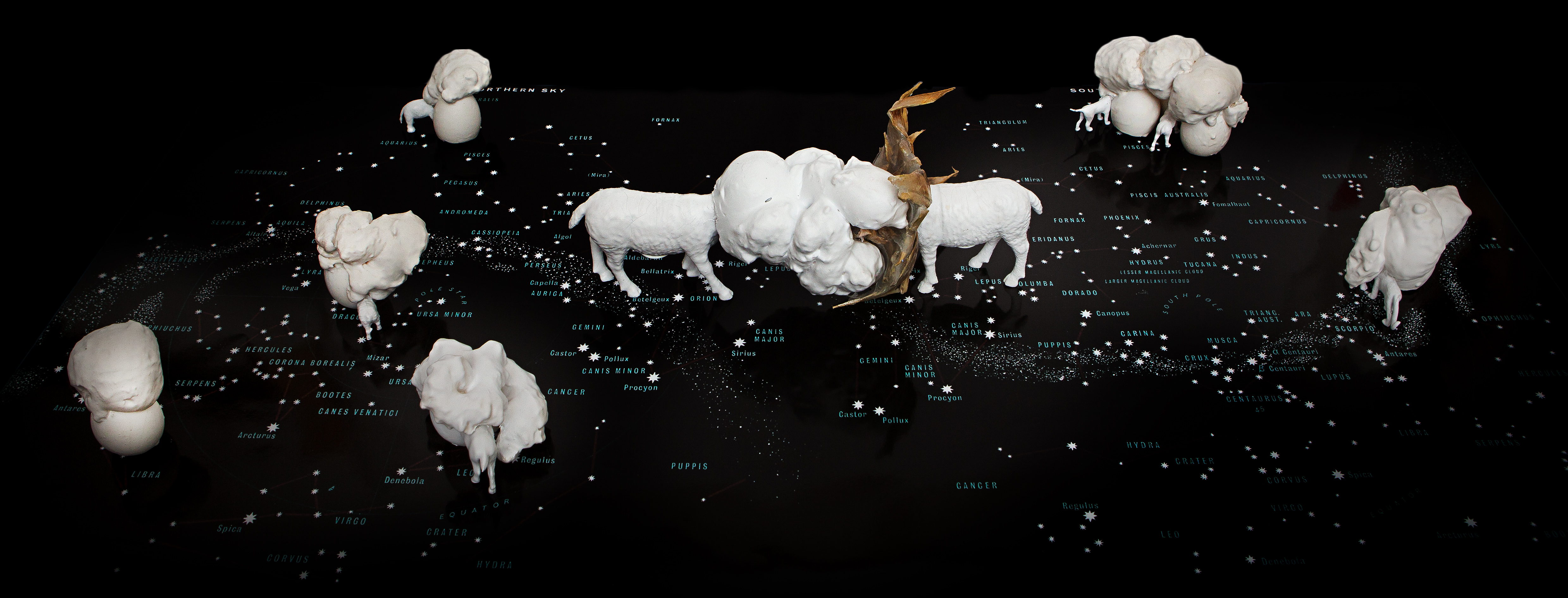 Installation on sky map, plastic found materials, PU foam, silicone, spray paint, silicone paint, eggs, plants.