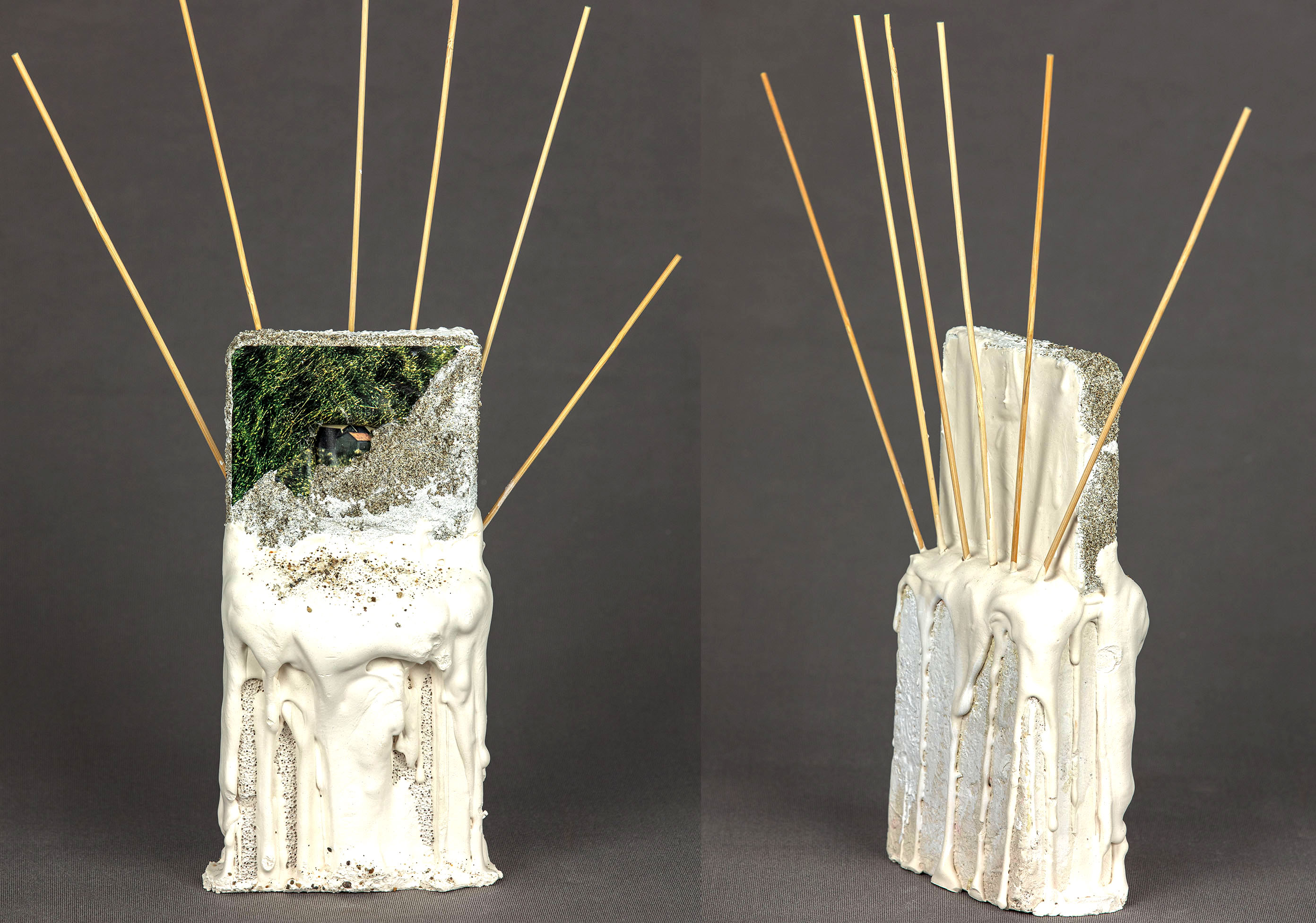 Canvas on aerated concrete, sand, plaster, paper, acrylic, wooden sticks. 38x33x6cm.2022