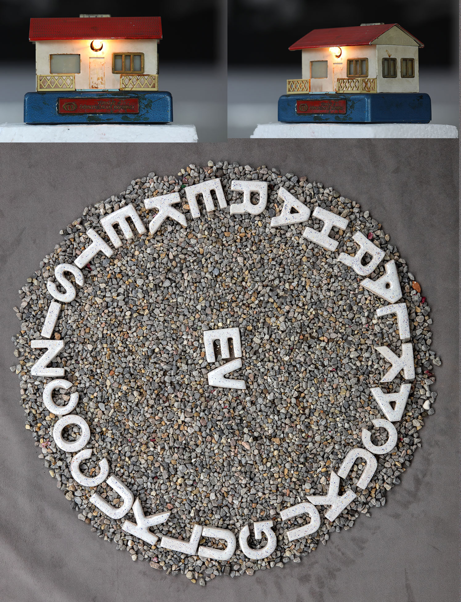 Installation. Ceramic letters on pebblestone. 50x50cm.. Illuminated ready made object, house.15x16x11cm.15x16x11cm.2022